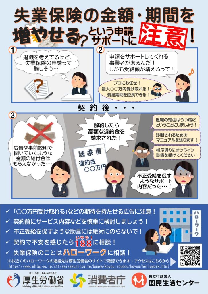 現在、全国の消費生活センター等には、「実際に依頼したが増えなかった」、「途中で申請を断ろうとしたら、違約金を請求された」や「うつ病などのメンタル不調ではないのに、言うとおりに診断書をもらうように言われた」などの相談が増えております。